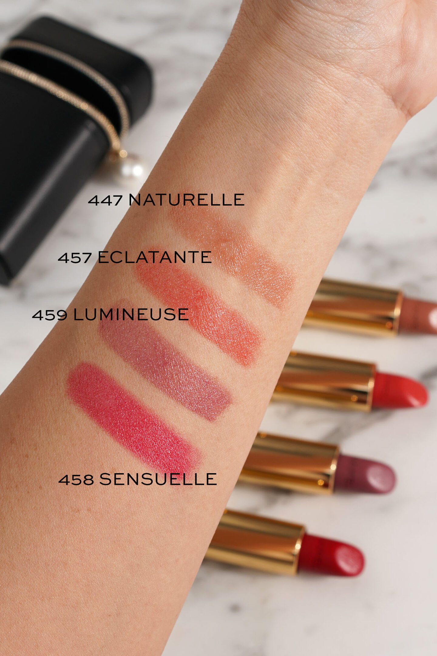 The Rouge Allure Velvet Les Perles formula is a smooth luminous matte lipstick. They have an ultra fine pearl quality to them which gives them a glow while still looking like a matte on the lips. These are so soft and smooth on the lips. They glide on beautifully and you can control the pigment to be more of a blotted blurred effect or layer for more opacity.