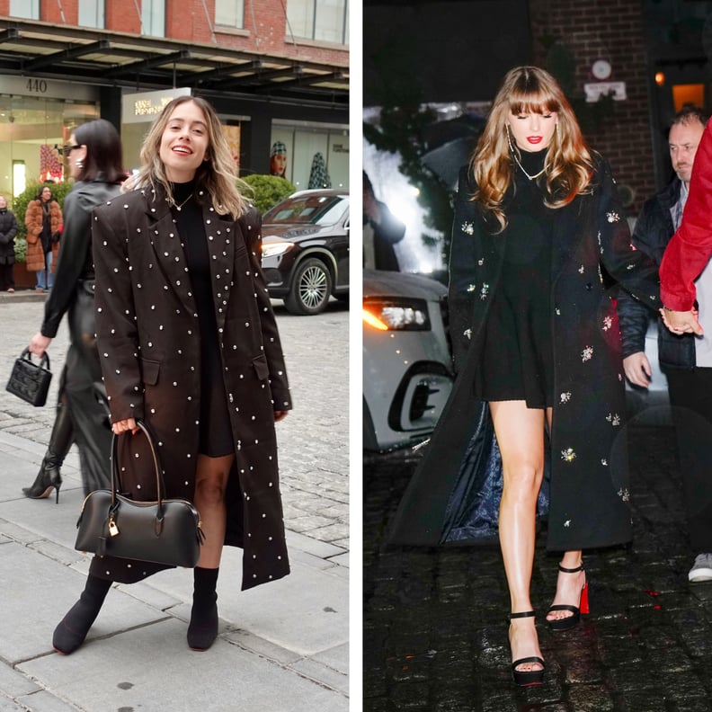 For date night, Swift wore the dress under Simkhai’s embellished Gianni coat with a fringe Stella McCartney Falabella tiny tote bag, Christian Louboutin platform sandals, De Beers earrings, a Bonbonwhims necklace, and gold Cartier watch. I paid homage to the look with a similar Nasty Gal coat that’s now sold out, a Stella McCartney Ryder bag to reflect her love for the designer, and Vivaia sock boots with fitting red soles. I even applied the same Ruby Woo lipstick and added Swift-inspired jewelry to round out the moment.