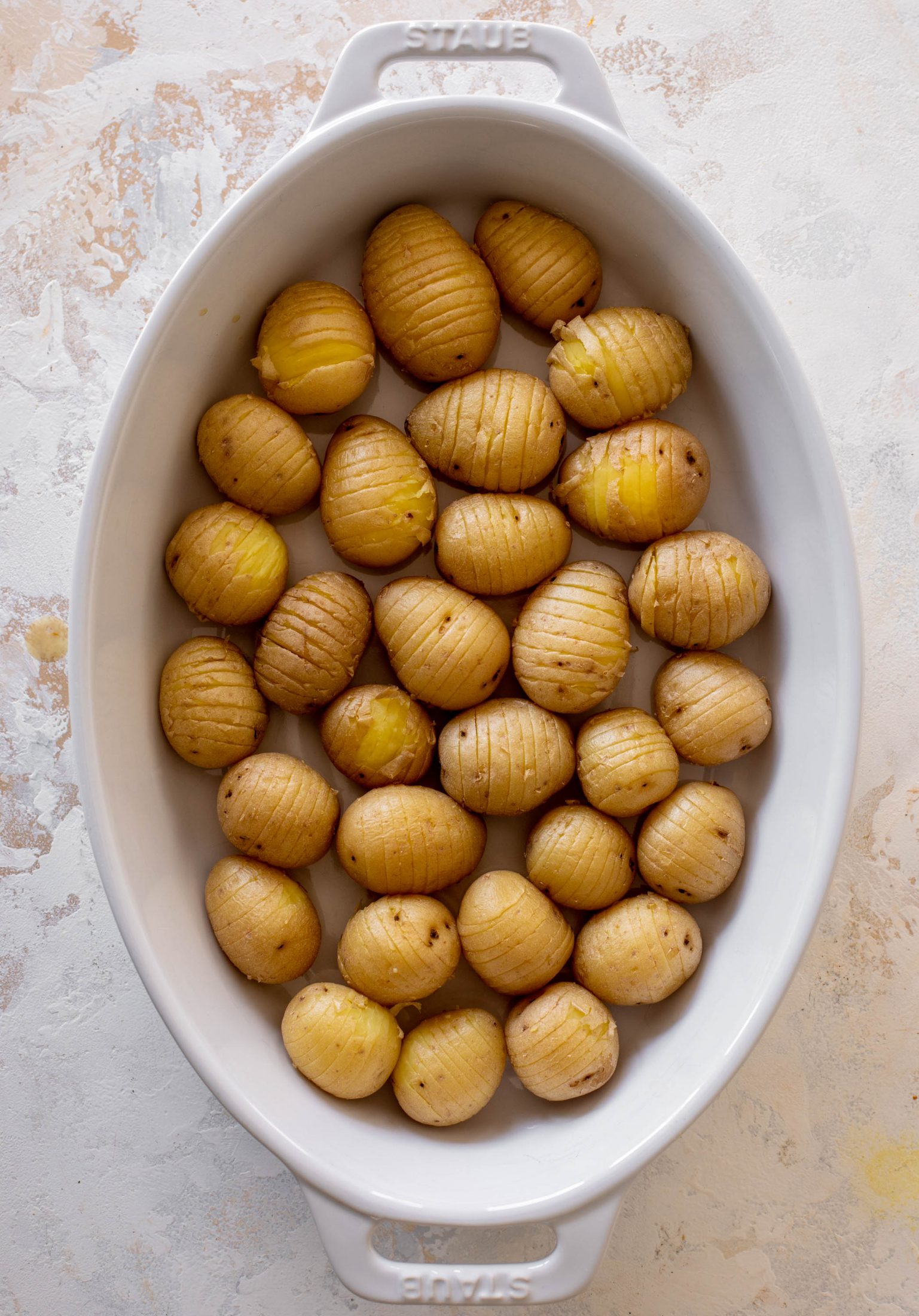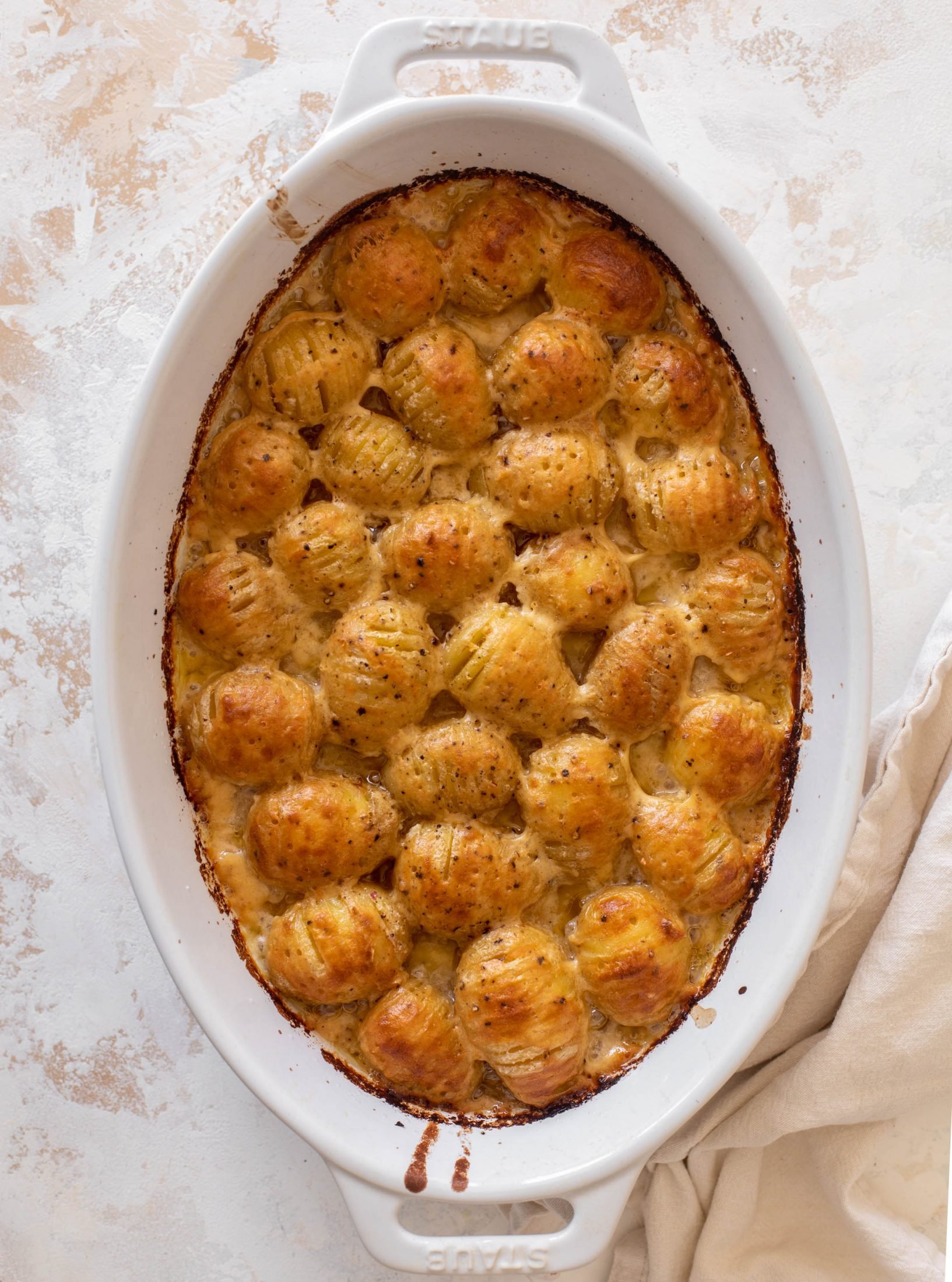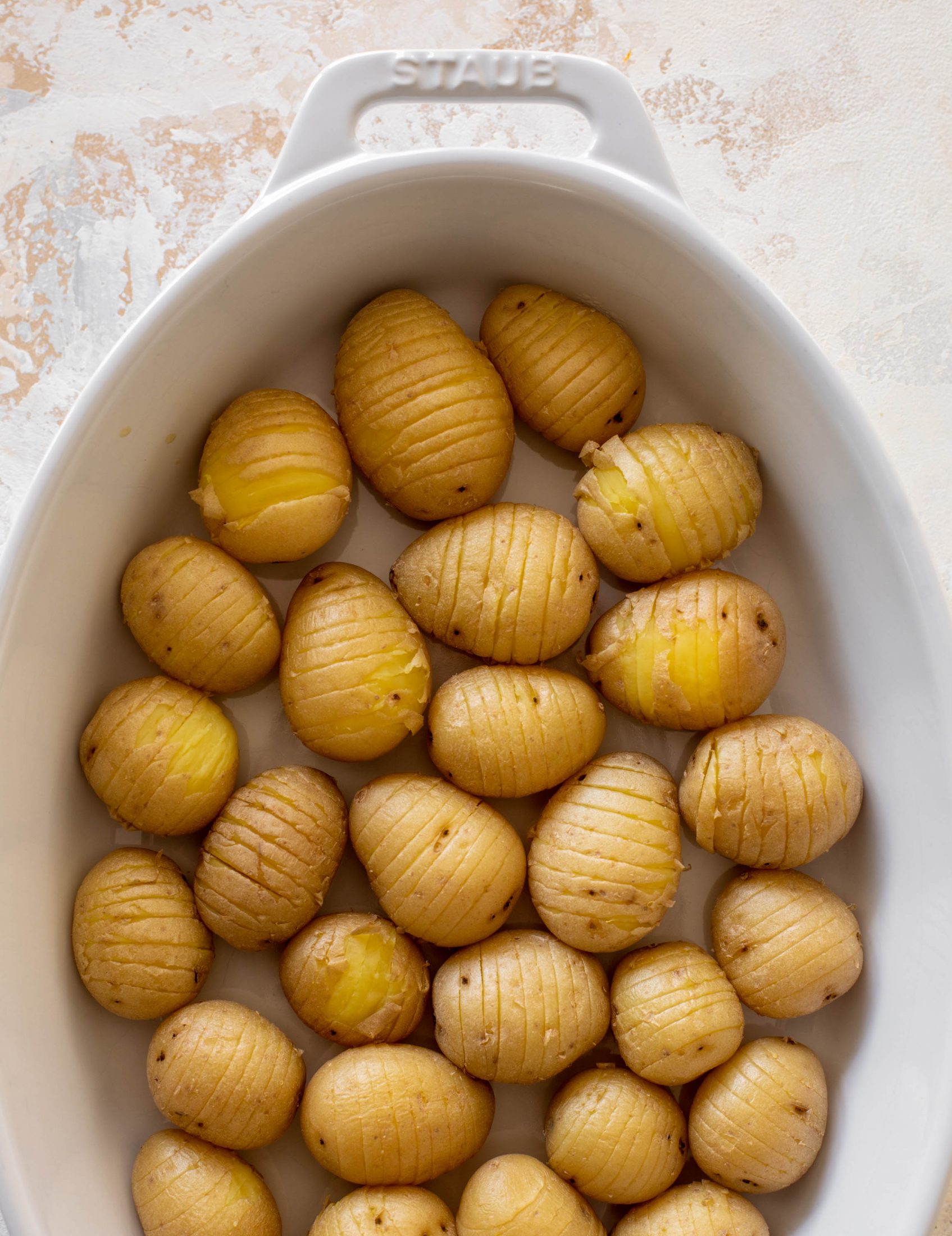 If you’re really feeling frisky, you can stuff something tiny into the mini hasselback potatoes. Like maybe a small slab of garlic butter or even a shred of cheese. But trust me, the quick bechamel is doing the work for us here.
