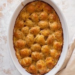 These scalloped hasselback potatoes are made with mini gold potatoes, sliced super thin, roasted until crisp and then baked in a cheesy bechamel sauce. They are a decadent, delicious side dish that is beautiful too!