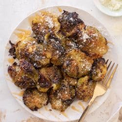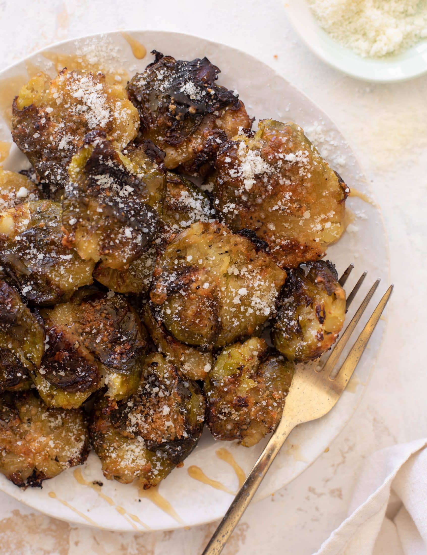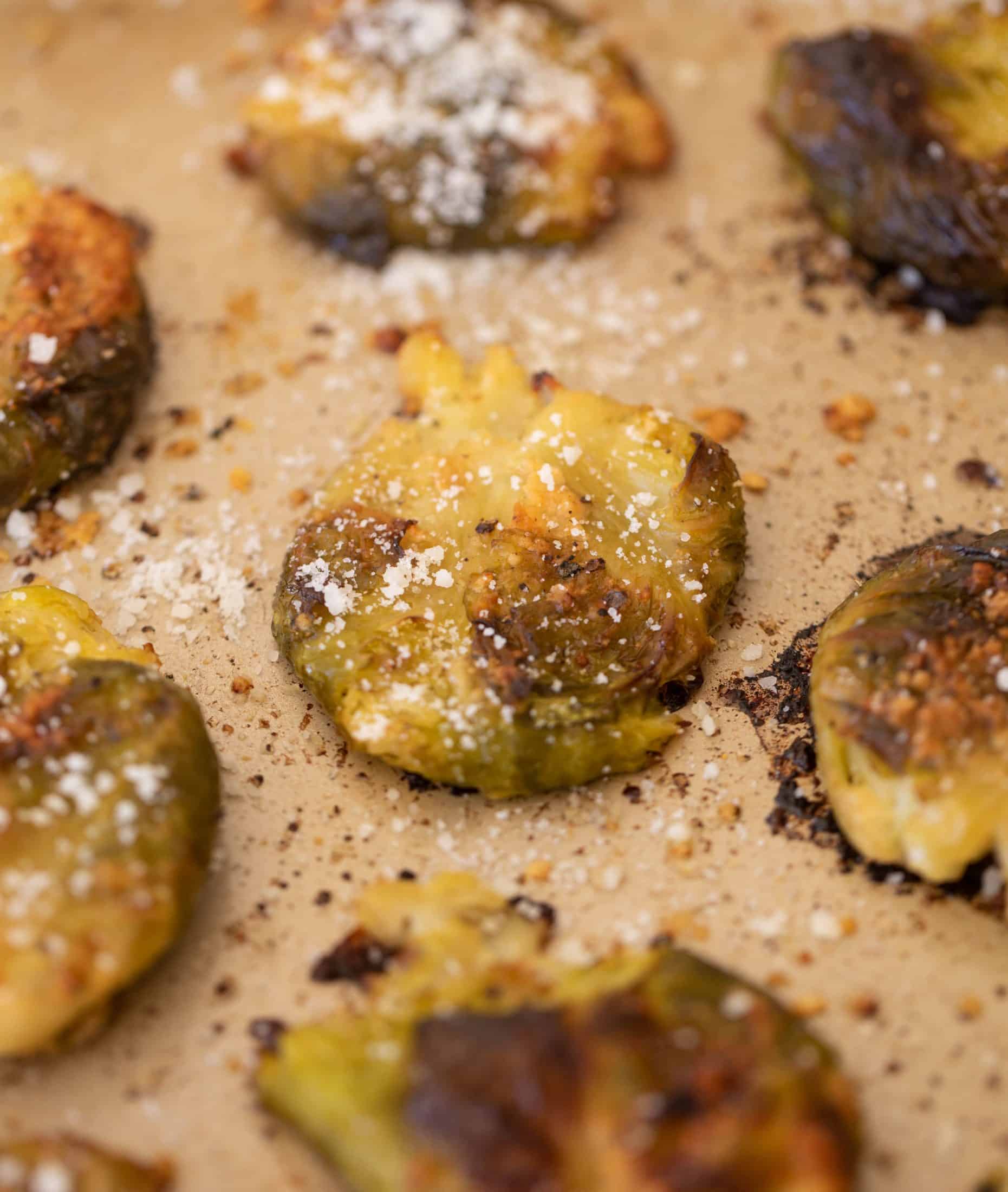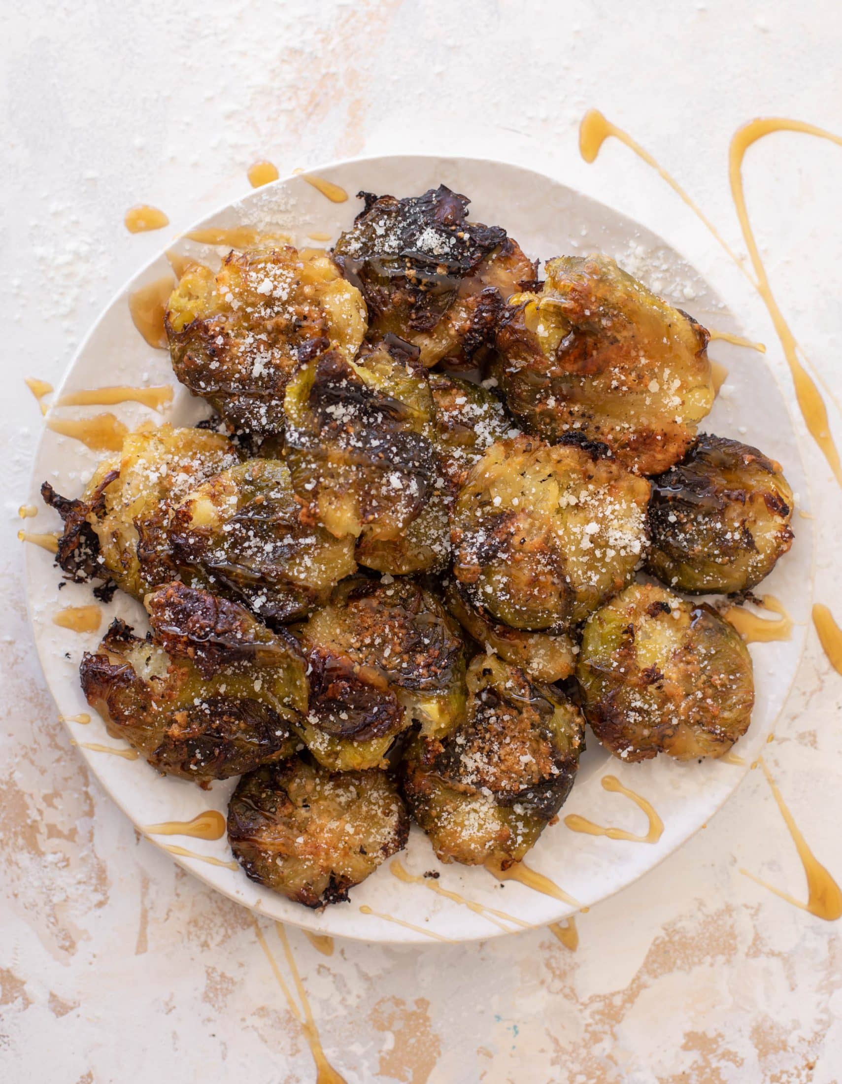 Parmesan Smashed Brussels Sprouts with Hot Honey