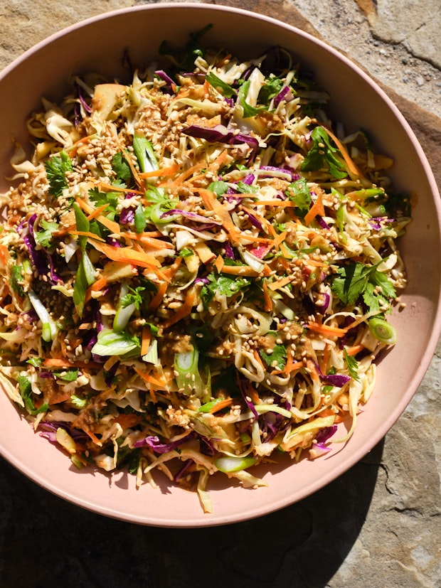 We had a bunch of cabbage come out of the garden this year. I basically made one thing with it, a feathery slaw made from shredded green and red cabbages, apples, carrots, and scallions tossed with a spicy sesame dressing. Hands down, it’s my favorite coleslaw recipe. If you’ve ever had asparagus or spinach goma-ae at a Japanese restaurant you’ll recognize the inspiration for the dressing. Toss it all together, and you’ve got a great slaw on your hands. It’s good on its own. This slaw is fantastic on tacos and perfect as a side to soba noodles. I’ve even thrown a few big scoops in a bowl of short pasta with a few chickpeas and called it lunch. Prep a big bowl and enjoy it for days.