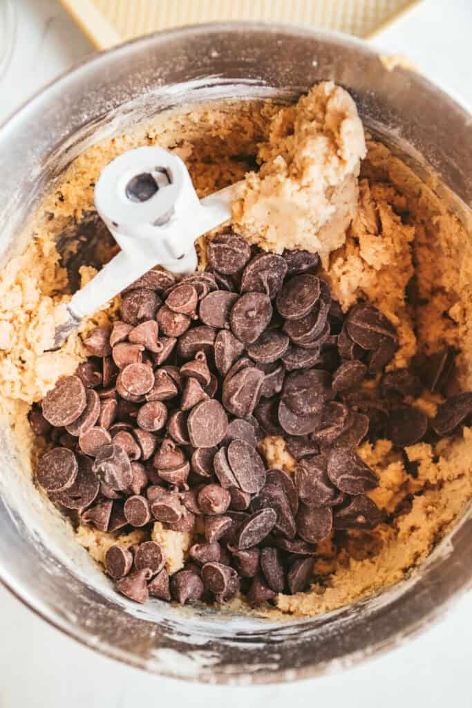 - Step 4: Bring It All Together. Add the dry ingredients to the butter mixture and mix on low speed until just combined. Toss in the chocolate chips and mix just until the chips are distributed. Try not to overmix.