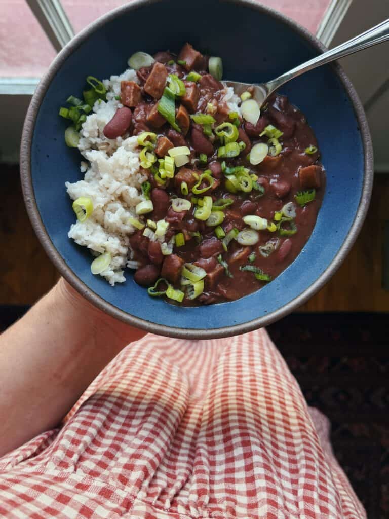 • Something about the hottest days of summer have me missing New Orleans lately. I posted about it here and so many of you confirmed that New Orleans is a place you miss forever once it gets in your spirit. One of the things that can fix an achy New Orleans heart is a big ol’ bowl of Red Beans and Rice. To be fully transparent, I was feeling a bit lazy and cracked open a can of Blue Runner Red Beans and added some extra sautéed onions, peppers, and sausage and it hit the spot. (Joy the Baker)